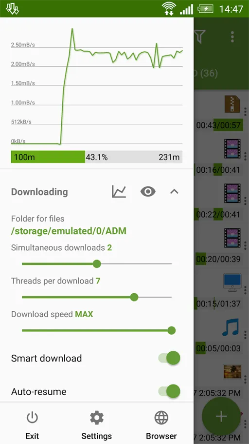أثناء عمليات التحميل لا تضطر للانتظار داخل التطبيق للحفاظ على تقدم العملية بل يمكن الإنتقال للتطبيقات الأخرى الموجودة بالهاتف والإستمتاع بالخدمات الخاصة بها دون قيود أو تعارض مع التنزيلات التي تقوم بها وذلك لأن Advanced Download Manager يدعم التحميل في الخلفية, كما يمكنك تحديد الملفات المراد استئنافها في التحميل للحفاظ على سرعة الإنترنت, التطبيق يمتلك واجهة رئيسية بسيطة وسهلة في التعامل معها, بالإضافة لكل هذه الخدمات حرصنا اليوم على توفير النسخة المهكرة من تحميل تطبيق ADM والتي تجعلك تستمتع بتجربة أفضل لأنها توفر خدمات حصرية.