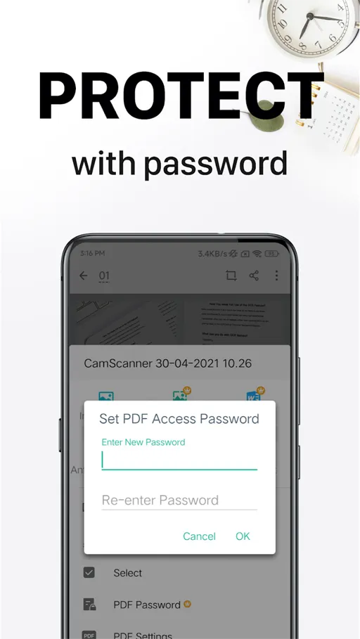 - الطباعة اللاسلكية : يدعم تطبيق كام سكانر مهكر أيضا خدمة الطباعة اللاسلكية التي بواسطتها يمكنك طباعة هذه المستندات بصورة سهلة دون الحاجة منك لتوصيل أي أسلاك, كما يحتوي برنامج CamScanner مهكر أيضا على خدمة تأمين الملفات التي تقوم فيها بوضع كلمة مرور للملف لكي لا يتمكن أي شخص أخر من الوصول لهذا الملف دون إدخال كلمة المرور التي قمت بتعيينها.