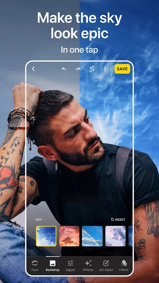 - وضع السماء : لا ننكر أن هٌناك تطبيقات أخرى تعمل على وضع سماء في الصورة المناسبة, لكن التطبيق يختلف عنهم في أداة تلك الخدمة حيث يوفر تطبيق Lensa مهكر سماء صافية أو بها غيوم وأخرى بها برق ورعد وعند وضع أي شكل على السماء في الصورة ستشعر أنه حقيقي وهذا بفضل الذكاء الإصطناعي.