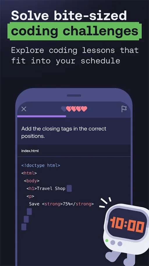 - دروس تفاعلية : بعد “تحميل برنامج learn Coding Programming Mimo” لن تتوقف الكورسات على معلومات ودروس منهجية فقط بل سوف يقدم دروس تفاعلية رائعة تحتوي على إختبارات و تمارين فعلية ودائمة تٌساعد على تثبيت المعلومات بشكل أفضل.