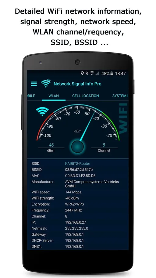 أولاً فـ بعد تحميل تطبيق Network WIFi Info مهكر اخر اصدار سوف تتمكن من التمتع بخدمة مميزة وهي الوصول لمعلومات شاملة حول قوة إشارة الشبكة المحلية والخلوية الخاصة بك أو المتاحة في موقعك الحالي, والتطبيق لا يقدم الخدمة بشكل غير متكامل أو تقليدي بل سوف يعمل على عرض مستوى قوة الإشارة بشكل رقمي وواضح وهذا الأمر يٌساعد المستخدم في تحديد أفضل مكان لاستخدام أجهزتهم بالنسبة للشبكة ونوعية الإتصال والإشارة.