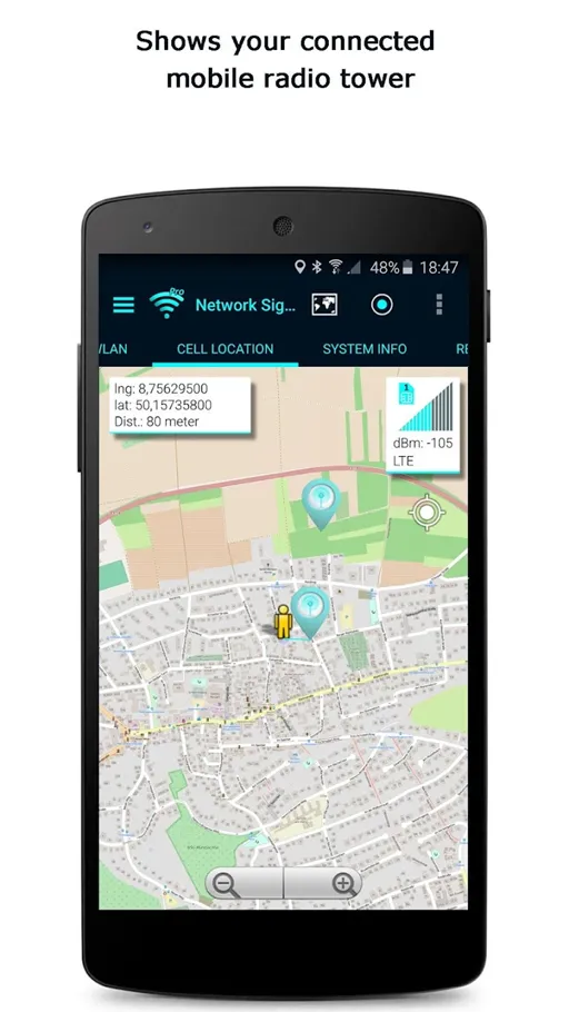 - ( Cell Location / موقع الخلية ) : ثالث الصفحات وهي الخاصة بالخدمة الرائعة والمبتكرة بعد تحميل برنامج WIFi Signal Info مهكر أحدث إصدار في التعرف على قوة الإشارة بالنسبة للشبكة العامة في منطقتك, يقوم التطبيق بعرض خريطة شاملة لموقع المستخدم الحالي وفي هذه الخريطة يجد مواقع أبراج الخلية القريبة.