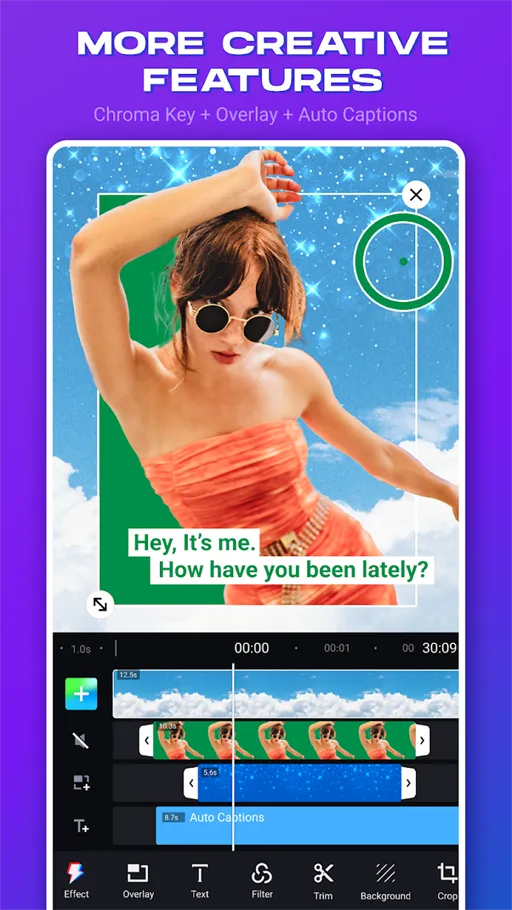 من الخواص النادر توفيرها في التطبيقات الخاصة بالهاتف نجد ميزة مفتاح الكروما الخضراء, في الواقع هذه الميزة خاصة بالأفلام والأنميشن ولذلك لما تتوفر كثيراً في تطبيقات الهواتف, ولكن نجد أن برنامج مونتاج مهكر شوت كات يوفرها بشكل إحترافي ومعها يوفر قوالب وملصقات متحركة ومتميزة يٌمكن الإستعانة بها في صناعة مقطع جيد, مفتاح الكروما الخضراء عبارة عن عزل الخلفية الخضراء وراء أي شئ, عند تصوير شخص يجب أن تكون الخلفية خضراء أو تكون بلون موحد, ويقوم تطبيق ShotCut مهكر بمسح ذلك اللون ووضع الخلفية الجديدة التي تريدها أو الفيديو أو أي شيء آخر تريده.