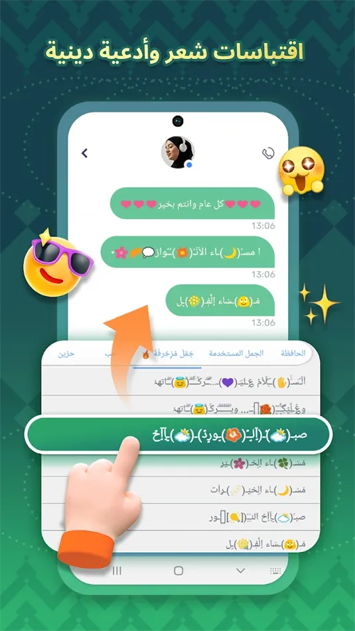 - الجُمل الجاهزة : يقدم كيبورد تمام لوحة المفاتيح العربية مهكرة لنظام الاندرويد مجموعة هائلة من الجُمل الجاهزة والتي يتم استخدامها بصورة كبيرة وبالتالي تستطيع الإنتقال للقائمة المحفوظ بها هذه الجُمل وتحديد الجملة المرادة لكي يتم كتابتها بشكل مباشر بعد تحميل كيبورد تمام لوحة مفاتيح عربية مهكر برابط مباشر.
