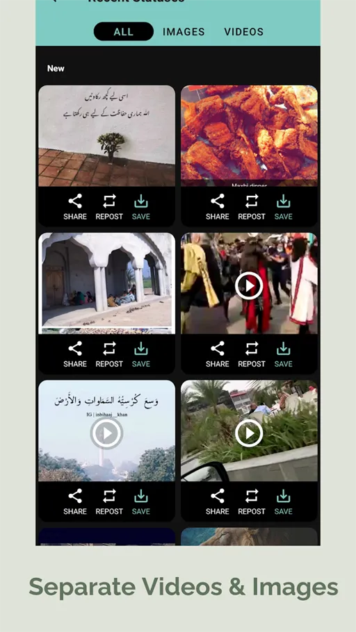 الجدير بالذكر أن هذه الصفحة الخاصة بالتنزيلات مُقسمة إلى فئتين وهما الصور ومقاطع الفيديو أي تقوم بتحديد الخيار الخاص بالفئة المرادة لكي تظهر لك حالات واتس اب الخاصة بهذه الفئة فقط, يجب العلم أن التطبيق يحافظ على خصوصية المستخدم حيث أنه يقدم تلك الخدمة في سرية تامة أي لا يتمكن صاحب تلك الحالة من معرفة أنك قمت بتحميل الحالة الخاصة به.